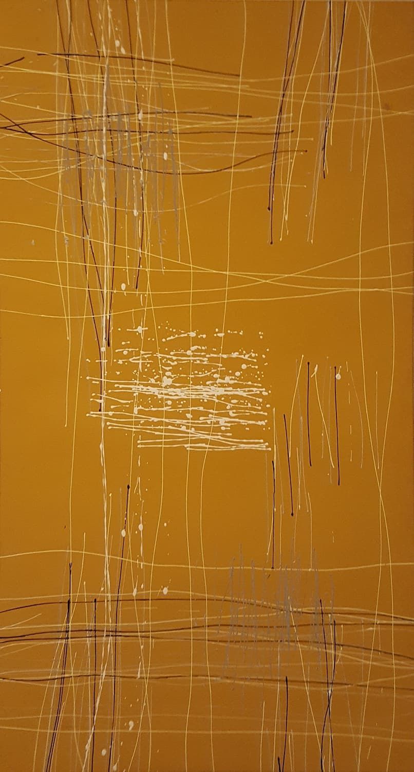 The artist was working on this artwork when the news flash hit the airways about the Beaconsfield mine collapse in Tasmania (on 25 April 2006). This event was to trigger the emotional response by the artist of painting the white shaft of light in this work as a spiritual plea to the heavens for their safe rescue.