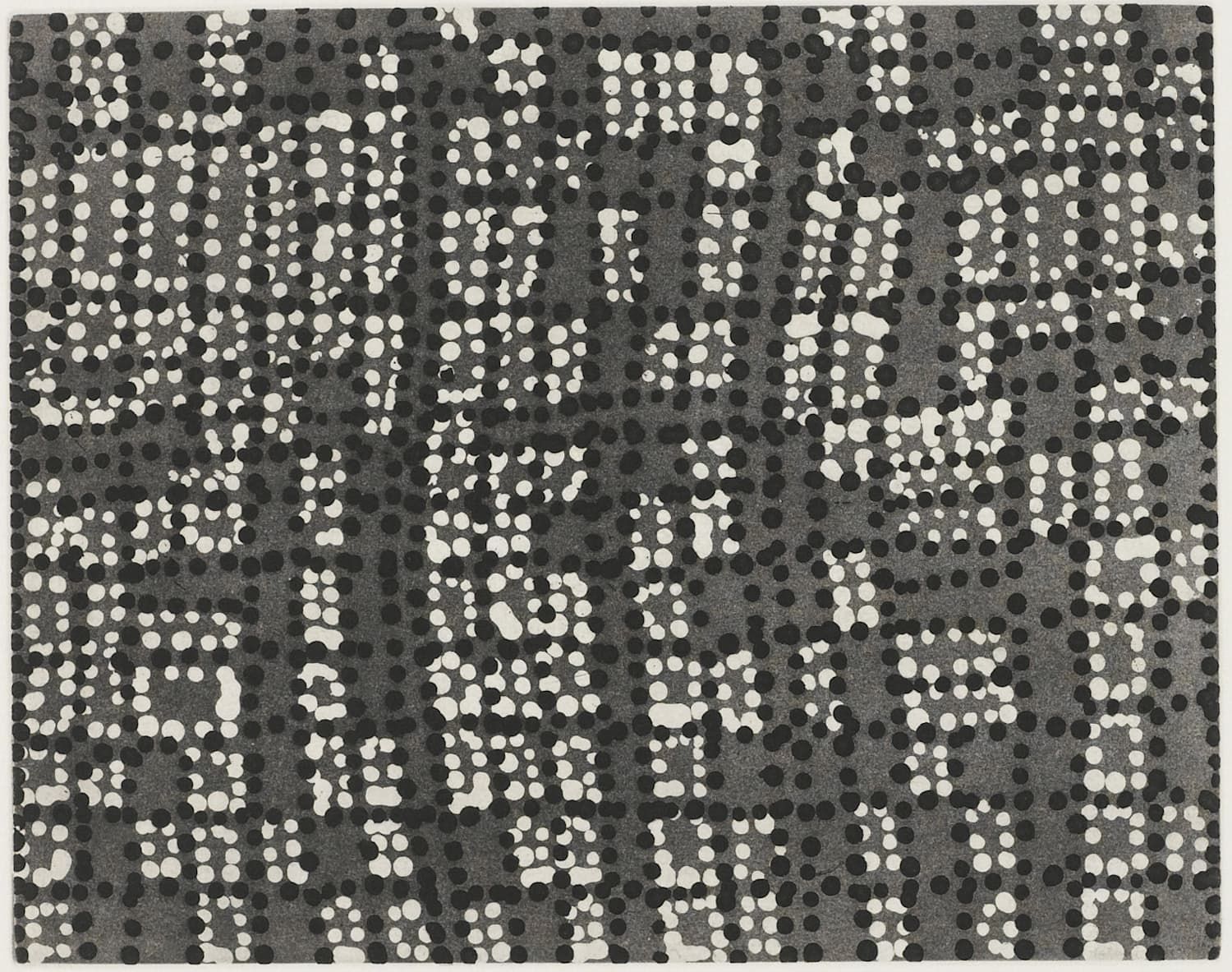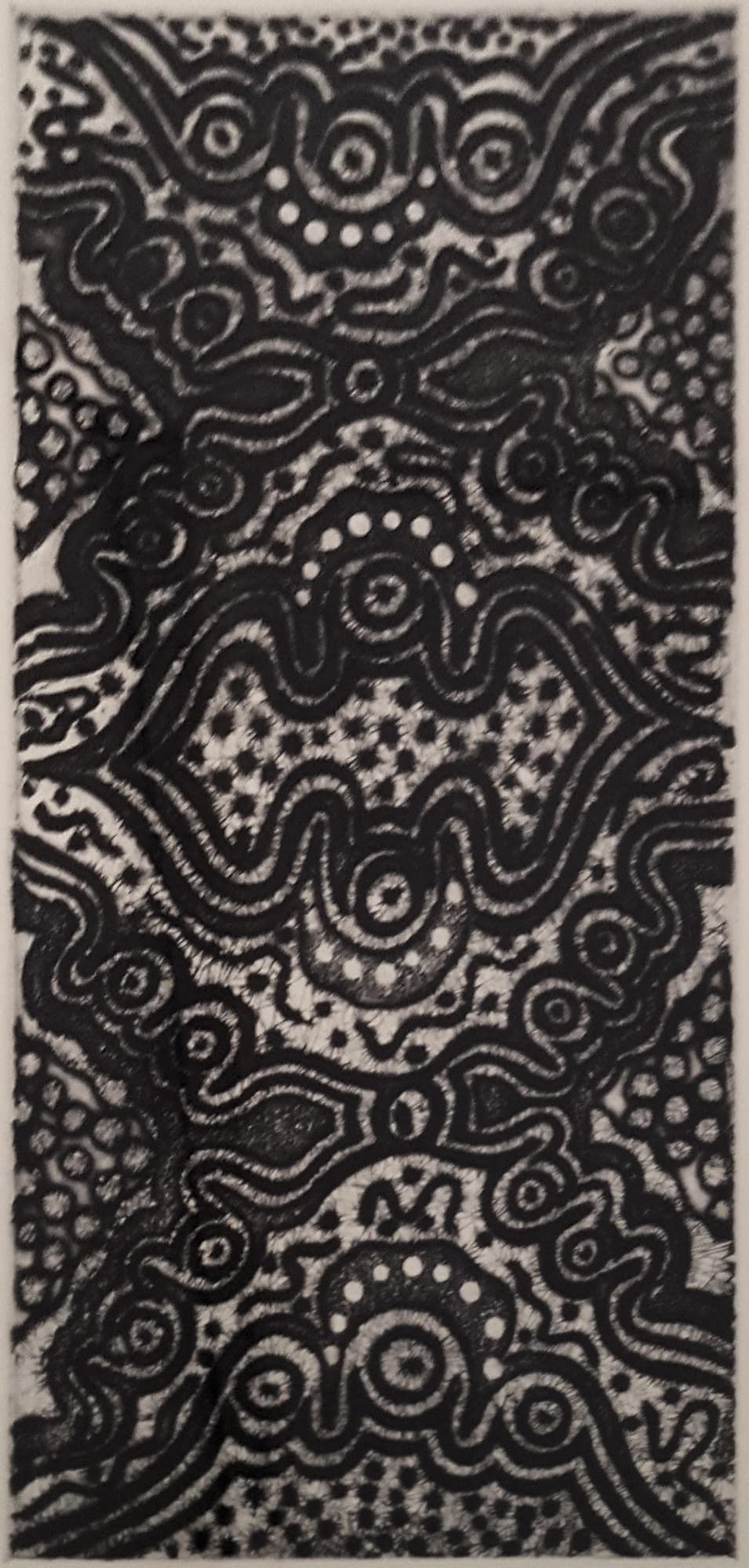 In this etching the artist has created striking black, grey and white designs depicting the ancestral women dancing across the country of Mina Mina across the terrain, around the soakages of Mina Mina and the crustations that form when rainwater recedes, through the spinifex clumps and over the sand hills.