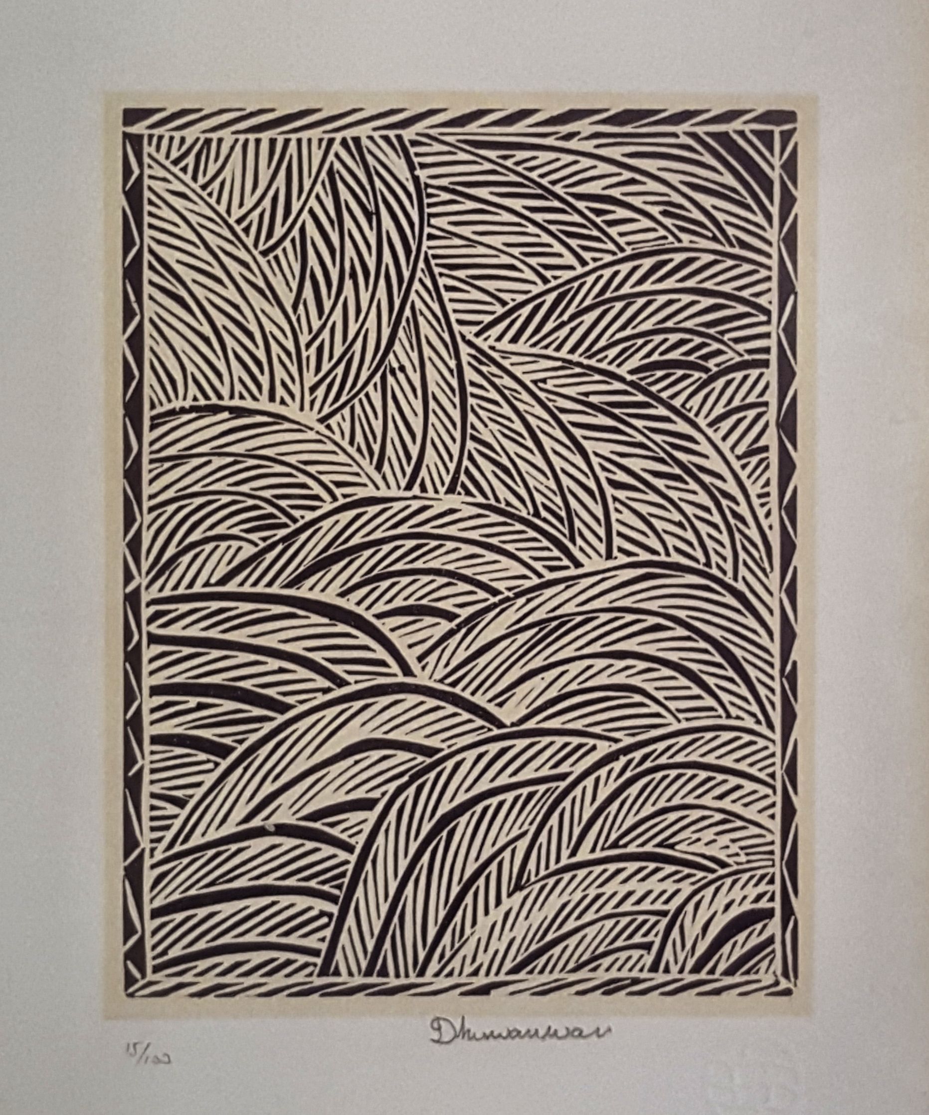 In this etching the artist has created striking black designs depicting the ancestral women dancing across the country of Mina Mina across the terrain, around the soakage’s of Mina Mina and it’s crustations of salt; through the Spinifex clumps and over the sand hills.