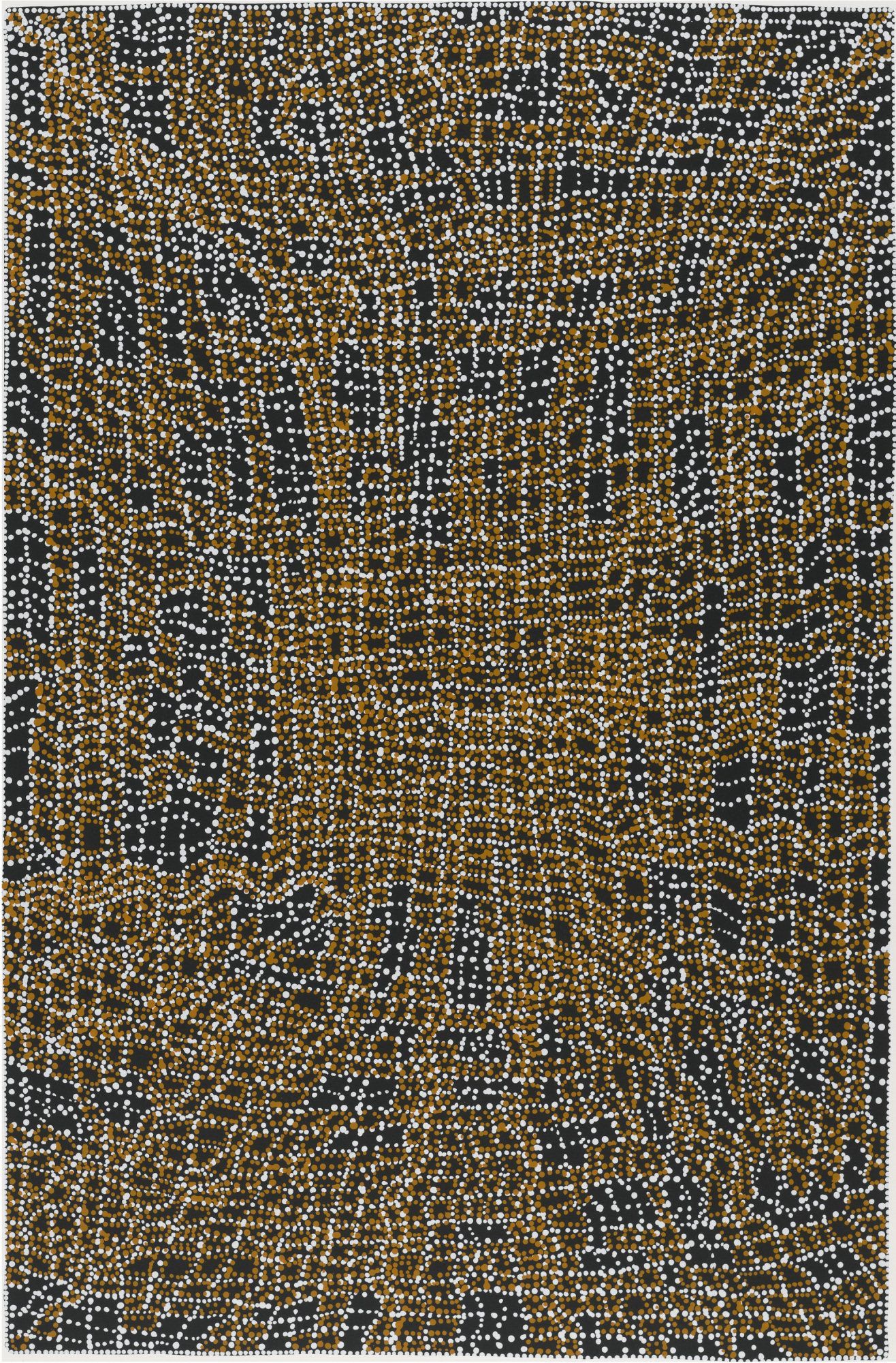 This work depicts ‘sandhills’ across the sacred site of Mina Mina, of which the artist is custodial owner. The site is located near Lake Mackay in the Tanami Desert, north of Yuendumu in the Northern Territory of Australia