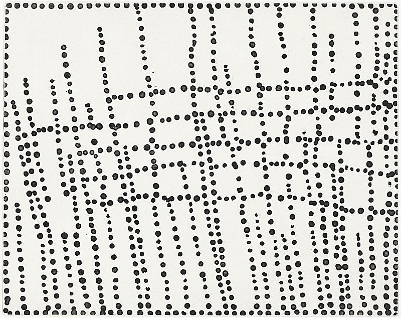 This Limited Edition Etching depicts a major women’s ceremonial site known as Mina Mina, the artist’s custodial country located near Lake Mackay in the Tanami Desert, north of Yuendumu in the Northern Territory of Australia. During the Jukurrpa Ancestral women of the Napangardi and Napanangka sub-section groups (aunt / niece relationship, in which knowledge is passed from one to the other) gathered to collect ceremonial digging sticks (Karlangu) that had emerged from the ground. They then proceeded east, performing rituals of song and dance, to the place known as Jankinyi. A large belt of trees (Allocasuarina decaisneana) now stand where these digging sticks once were.