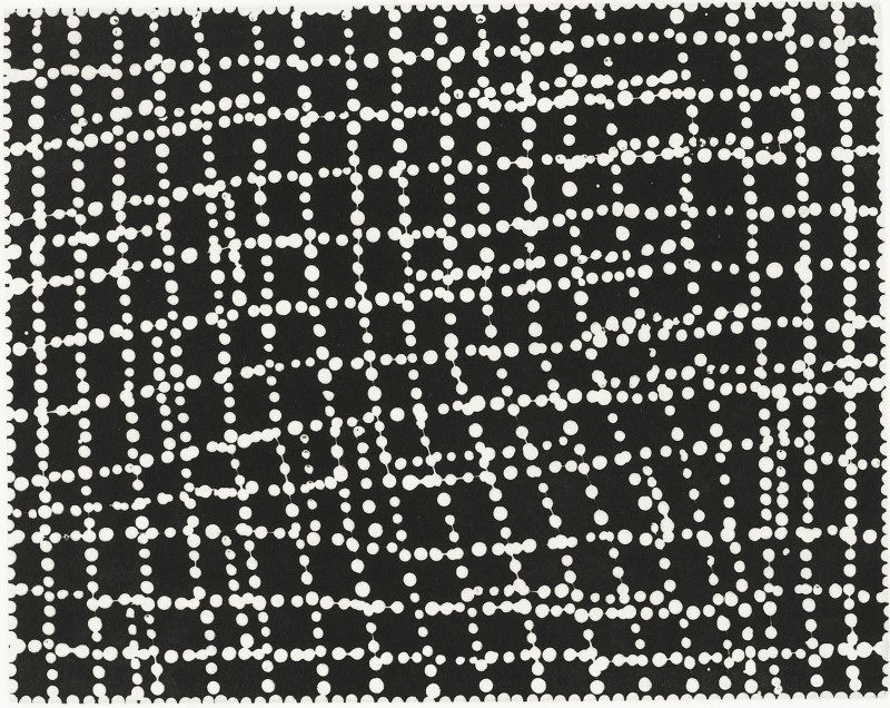 Depicts a major women’s ceremonial site known as Mina Mina. Topographically, the sacred site of Mina Mina is made up of two enormous soakage areas that, rarely filled with water, exist as clay-pans. As water soaks into the ground small areas of earth dry out and lift at the edges, becoming delineated by salt. In this striking diptych design of white and black dotting, Dorothy depicts the crustations of salt stretching infinitely onward, etched with the tracks of the women as their paths stretch on, crossing and merging; telling their stories.